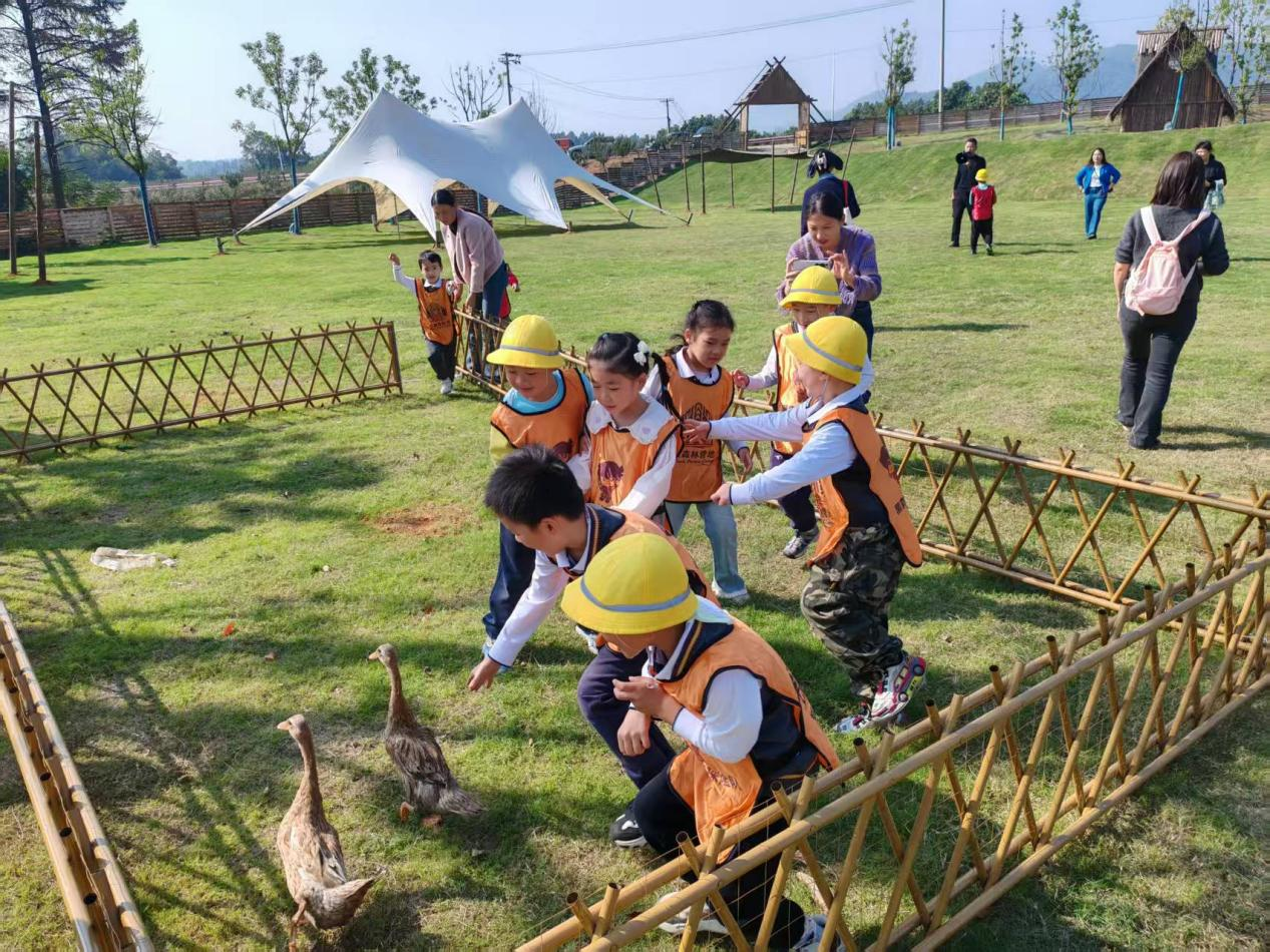 生态互动,与鸭群共谱农耕童谣。“嘎嘎嘎……”营地一角的鸭群迎来了一场温馨的“寻亲之旅”。孩子们化身成热心的小助手,帮助焦急的“鸭妈妈”,穿过草丛、越过小坡,帮助它寻找走散的“鸭宝宝”。在欢乐的护送游戏中,孩子们不仅亲身体验了牧鸭的乐趣,更在潜移默化中理解了家禽的习性以及它们在农田生态中扮演的重要角色。这既是一场童趣盎然的游戏,更是一堂生动的生命教育课。