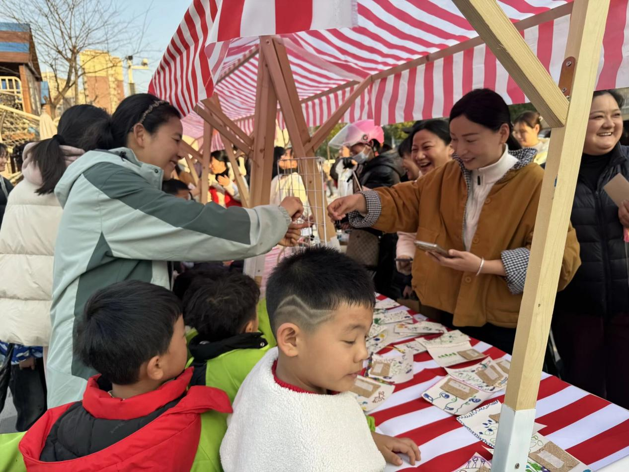活动当天,志愿者精心布置的八个义卖摊位成为一道充满童趣的风景线。“生态农园”摊位前,来自园内菜地的菠菜、青菜、大白菜、白萝卜整齐码放,带着泥土芬芳的新鲜蔬菜刚一亮相便吸引不少居民驻足,这些由孩子们亲手栽种、悉心照料的有机蔬果,既是劳动成果的展示,更是爱心传递的载体;“萌兔领养屋”前人气爆棚,几只活泼可爱的小兔子成为现场“焦点”,孩子们化身“小小饲养员”,认真向有意领养的居民介绍喂养知识,在传递萌趣的同时,播撒生命关怀的种子;“希望种子铺”摆满了各色花种、菜种,包装上贴着孩子们手绘的爱心贴纸,寓意着将绿色与希望一同传递;手工饼干摊位飘来阵阵香甜,造型各异的饼干均由孩子们参与制作,每一块都承载着满满的心意;糖画摊位前,非遗传承人手持铜勺,以糖为墨、以板为纸,灵动的线条勾勒出龙、凤、小兔子等图案,晶莹剔透的糖画不仅让孩子们感受传统技艺的魅力,更成为义卖场上的“抢手货”。琳琅满目的商品与孩子们热情的吆喝声,让整个爱心集市充满生机与暖意。