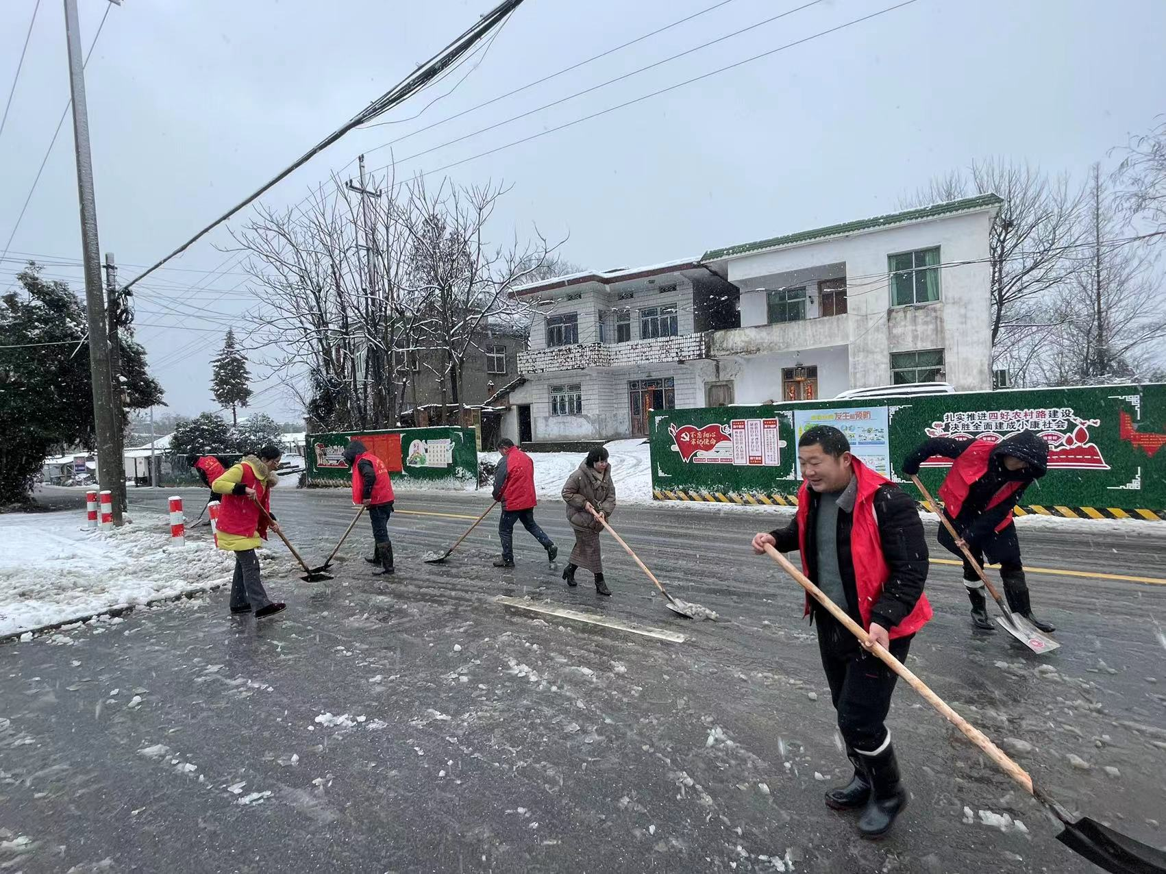 与此同时,沈弄村村委会赵永革书记将部分村干部抽出,编为两个小组,对村委会周边道路和危房进行了安全隐患的排查,确保将安全隐患降低到最小。在扫雪过程中,村干部争先恐后,干劲十足。漫天的大雪,凛冽的寒风,丝毫没有挡住村干部们的扫雪热情。经过2个多小时共同努力,道路上的积雪基本被清扫干净,减少积雪给村内主干道交通带来的安全隐患,保障了前来村委会办事的村民以及过往车辆、行人的出行安全。