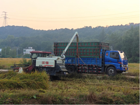 田野里两台收割机正开足马力“驰骋”,伴随着阵阵轰鸣,沉甸甸的稻穗被快速收割、脱粒,金黄的稻谷源源不断涌入粮箱。当收割机粮箱即将满仓时,驾驶员缓缓将机器驶向等候的货车。随着卸粮筒缓缓伸出,金黄的稻谷如瀑布般倾泻而下,落入货车车厢,一幅“机器抢收、车辆快运”的丰收图景在秋日里格外热闹。田边,几位村民正帮着清理散落的稻谷,脸上满是欣慰。他们纷纷表示“以前收稻子,全家上阵弯腰割、手工打,累得直不起腰,现在看着机器跑一圈就完活,货车直接拉走,我们轻松多了!”