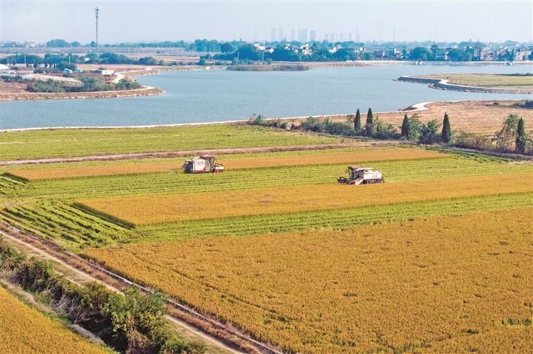 时下正值晚稻成熟期,在繁昌区平铺镇新平灌区,当地农民抢抓农时收割晚稻,一派丰收景象。近年来,繁昌区水利部门对新平灌区实施提升改造,完善水利基础设施,改善农业生态环境,实现涝能排、旱能灌,为粮食生产提供坚强的水利保障。(特约摄影师 肖本祥 摄)