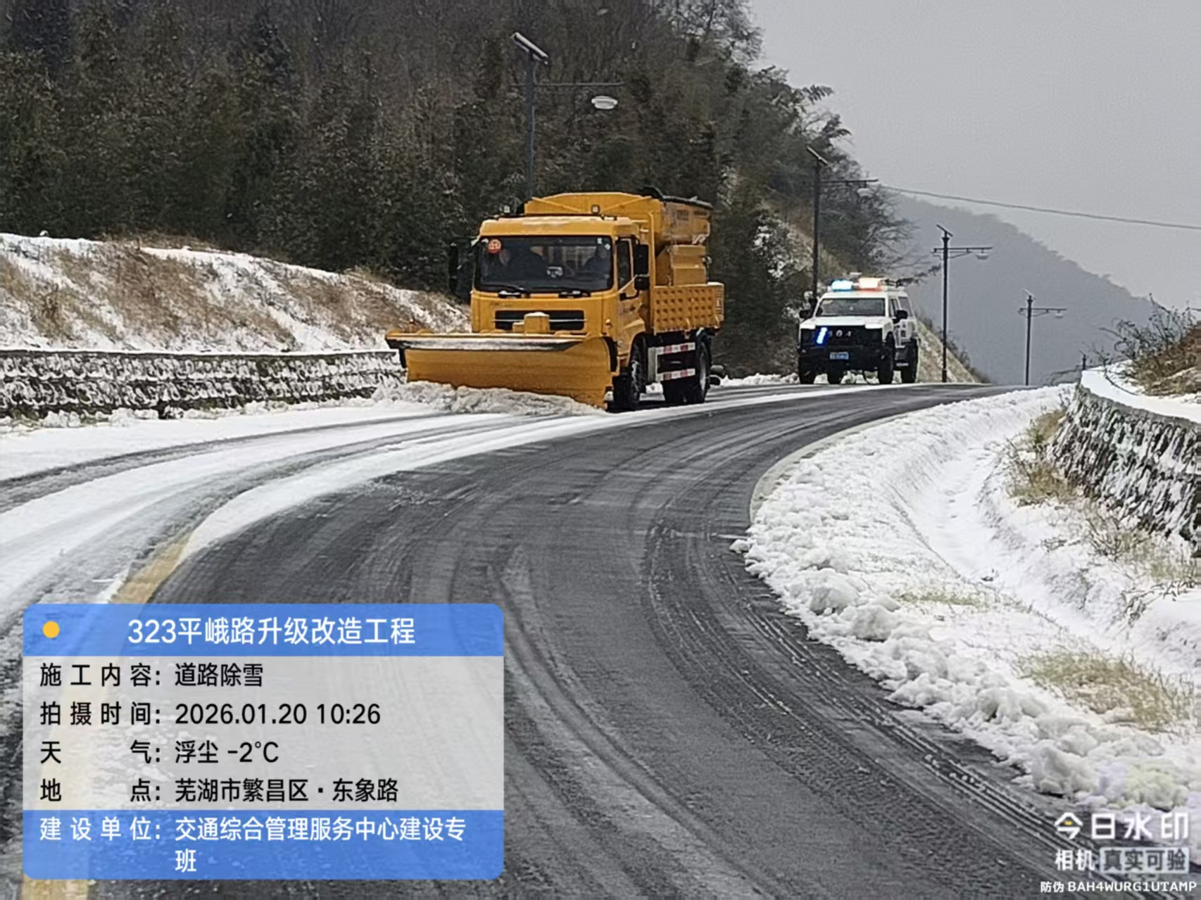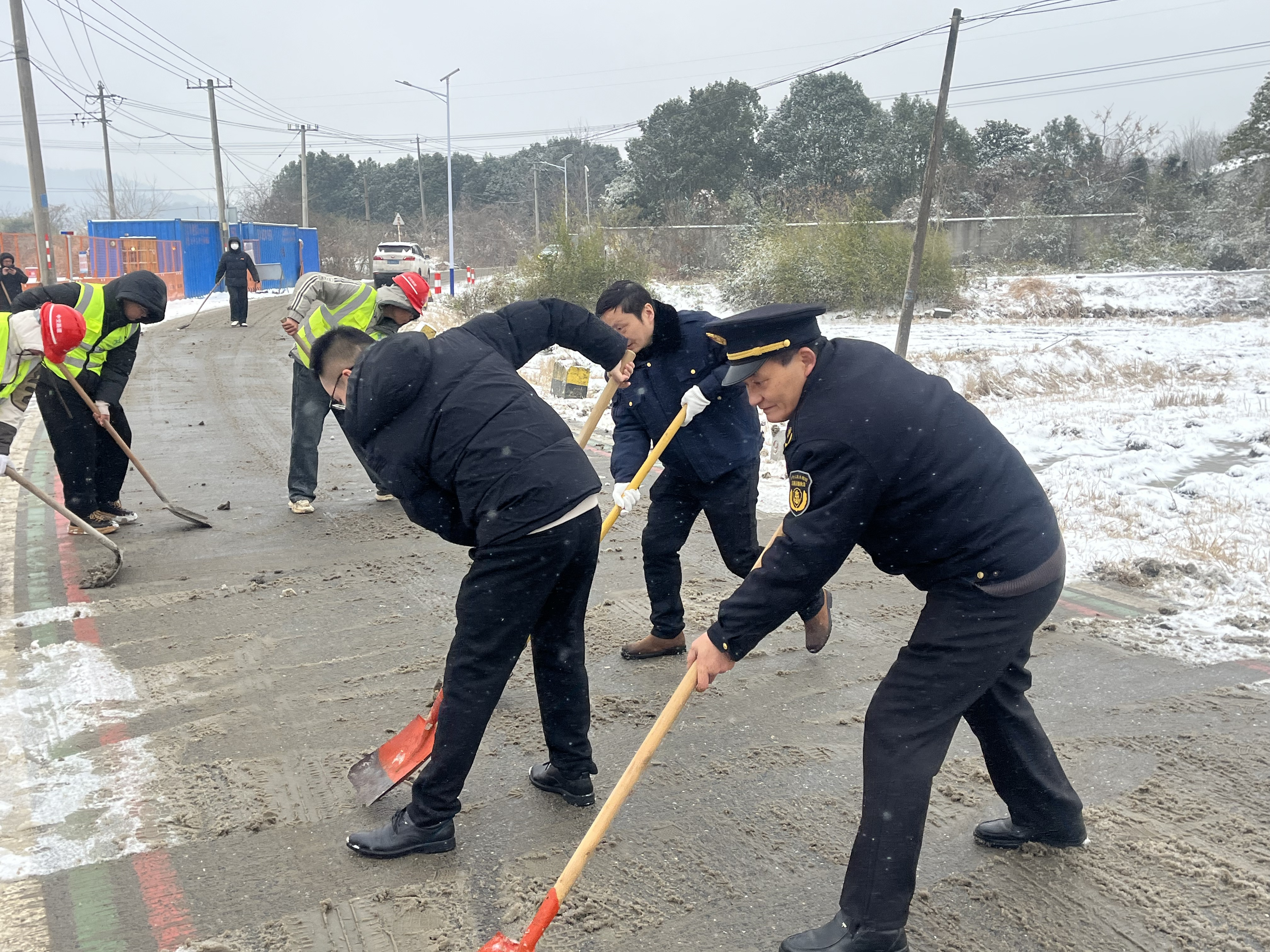 在建项目同步推进:G4211繁昌人字洞互通立交、323平峨路升级改造工程等在建项目现场,施工单位主动加入志愿队伍,与交通干部职工协同作战,机械除雪车、人工铲雪同步推进,快速清除施工路段及周边道路的积雪积冰。