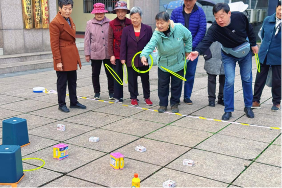 活动一开始,最受欢迎的“欢乐套圈”区域就排起了长队。肥皂、洗洁精、垃圾袋、油壶等琳琅满目的日常生活用品整齐地摆放在地上,吸引了众多老人的目光。老人们跃跃欲试,全神贯注地瞄准目标,甩出手中的套圈。每当有老人套中物品,现场便爆发出阵阵欢呼和掌声。小小的套圈不仅套中了实用的物品,更圈出了老人们满满的欢乐感和幸福感。“没想到我手气这么好,套中了一瓶洗洁精,太开心了!社区这个活动办得真有意思!”王大爷拿着“战利品”,脸上洋溢着孩子般的笑容。