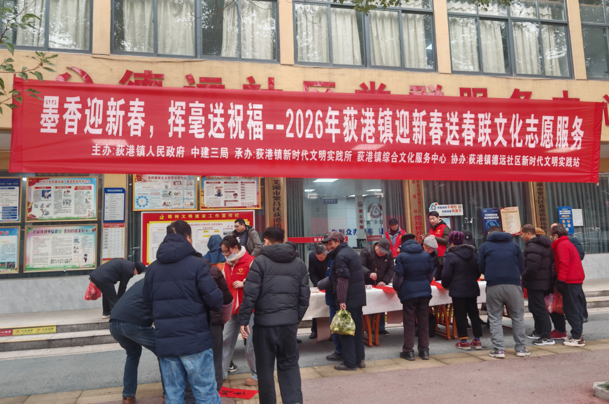 为进一步丰富社区居民精神文化生活,增进邻里情谊,凝聚社区向心力,1月29日,荻港镇德远社区新时代文明实践站联合镇综合文化站等多部门开展墨香迎新春挥毫送祝福——2026年迎新春送春联文化志愿服务活动,为辖区居民送上满满新春祝福与社区温情。