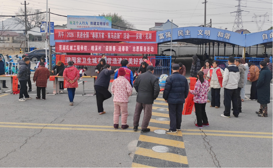 2026年2月2日,峨溪村党群服务中心广场热闹非凡,峨溪村村委会联合芜湖机械工程学校共同举办的“迎新春·送春联·惠民生”志愿服务活动温暖启幕,为村民们提前送上了浓浓的年味与贴心的政策宣讲。