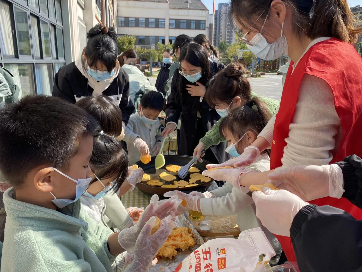 最受孩子们欢迎的当数柿子煎饼制作环节。志愿者与幼儿园老师提前准备好新鲜柿子、面粉、鸡蛋等食材,现场演示制作步骤。孩子们在志愿者的帮助下,亲手将柿子果肉捣碎、加入面粉搅拌、倒入平底锅煎制,一步步完成属于自己的柿子煎饼。金黄软糯的煎饼出锅后,孩子们互相分享品尝,脸上洋溢着幸福的笑容。活动现场香气四溢,既锻炼了孩子们的动手能力,也让大家在味觉体验中感受“霜降”时节的民俗特色。