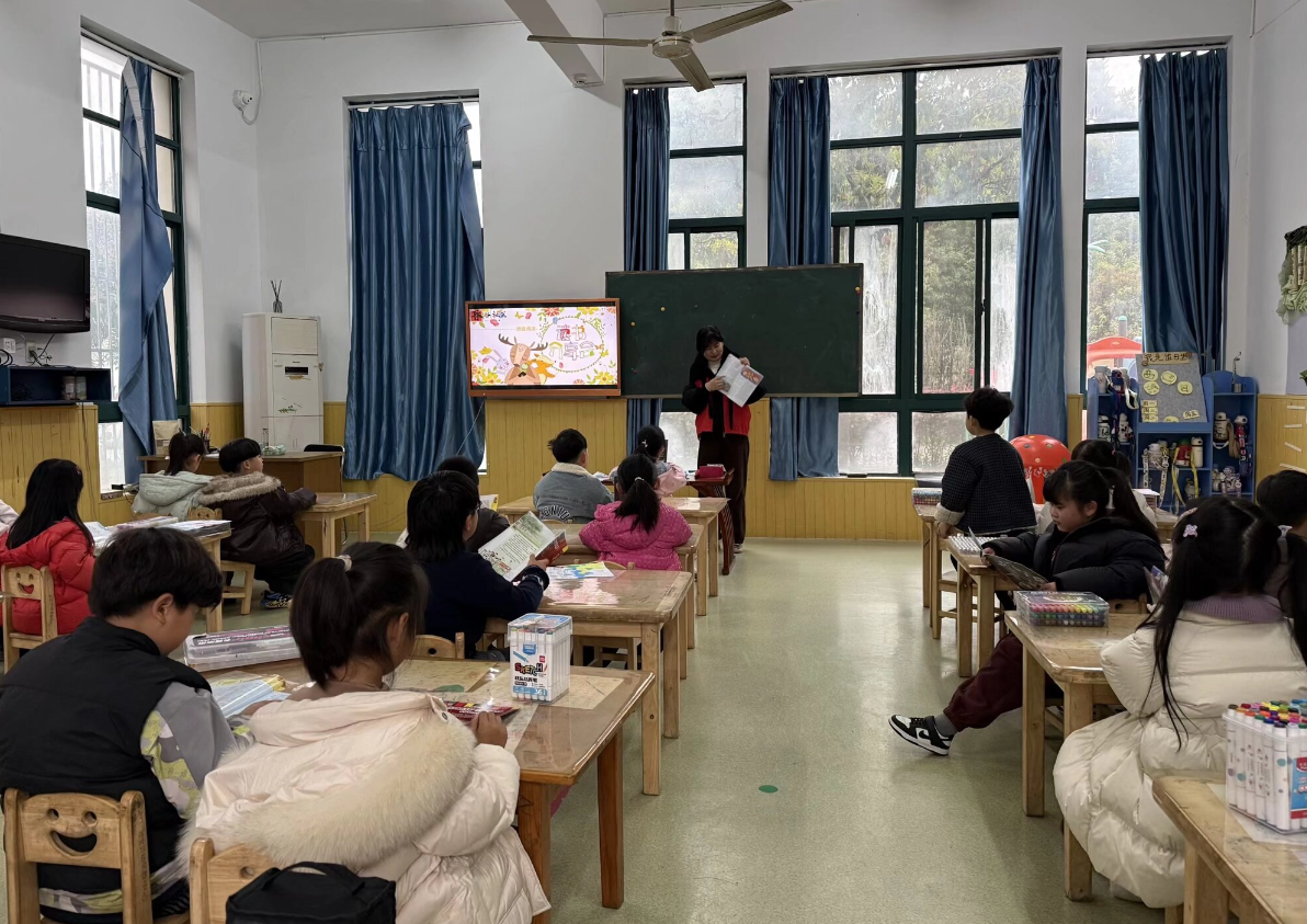 活动伊始,社区志愿者们带着精心挑选的绘本、童话故事、科普读物等各类儿童图书,来到教室,将一本本装帧精美、内容丰富的图书送到孩子们手中。孩子们接过崭新的书籍,迫不及待地翻阅,教室里洋溢着浓厚的阅读氛围。随后,志愿者化身“故事讲述人”,借助生动的绘本画面为孩子们讲述趣味故事。从充满奇幻色彩的童话世界,到贴近生活的科普小知识,志愿者们通过互动提问、情景模拟等方式,引导孩子们积极思考、大胆表达,不时抛出“故事里的小动物是怎么保护环境的”“我们可以为地球做些什么”等问题,孩子们积极参与互动,有的讲述自己的阅读感受,有的模仿故事里的环保行为,在轻松的氛围中感受文字与图画的魅力,理解阅读与生活的关联。