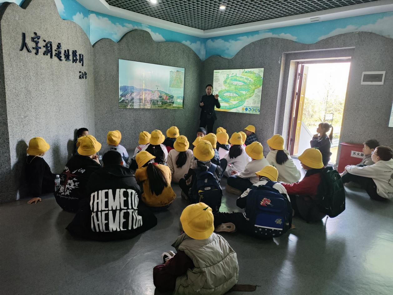 活动当天,孩子们头戴小黄帽,排着整齐的队伍,在巾帼志愿者和“五老”人员的细心引导下有序参观。在人字洞遗址陈列馆,讲解员用亲切、易懂的语言,向孩子们讲述了人字洞遗址的发掘历程,并介绍了出土的古生物化石、石器等珍贵文物。孩子们围坐在展板前认真聆听,眼中充满对远古文明的好奇与向往。随后,大家来到人字洞遗址现场,实地了解地质构造与发掘背景,沉浸式感受远古文明的厚重与魅力。