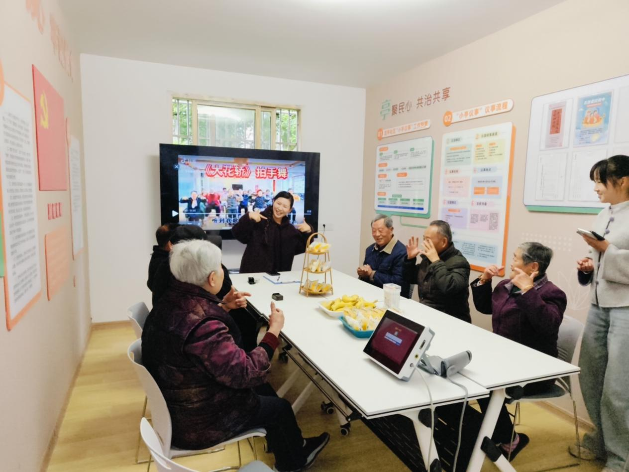 下午两点半,活动在温馨有序的氛围中正式开启。志愿者提前备好血压测量设备,为老人们逐一免费测量血压,认真记录健康数据,结合高龄老人身体特点,耐心讲解低盐饮食、规律作息、日常保暖等健康注意事项,用细致服务守护老人身体健康。健康服务结束后,伴随着欢快喜庆的音乐,志愿者带领老人们跳起《大花轿》拍手舞。舞蹈动作简单易学、节奏轻快,老人们跟着节拍舒展身体、互动拍手,现场气氛轻松活跃,彼此间的陌生感迅速消散,邻里情谊在欢声笑语中不断升温。几位老人笑着表示,这样的趣味舞蹈既锻炼了身体,又愉悦了心情,希望今后能经常参与。
